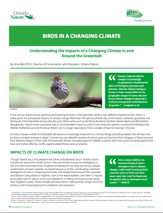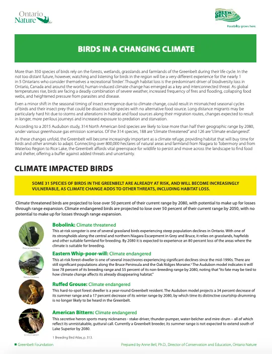 Some 31 species of birds in the Greenbelt are already at risk, and will become increasingly vulnerable as climate change adds to other treats, including habitat loss.
