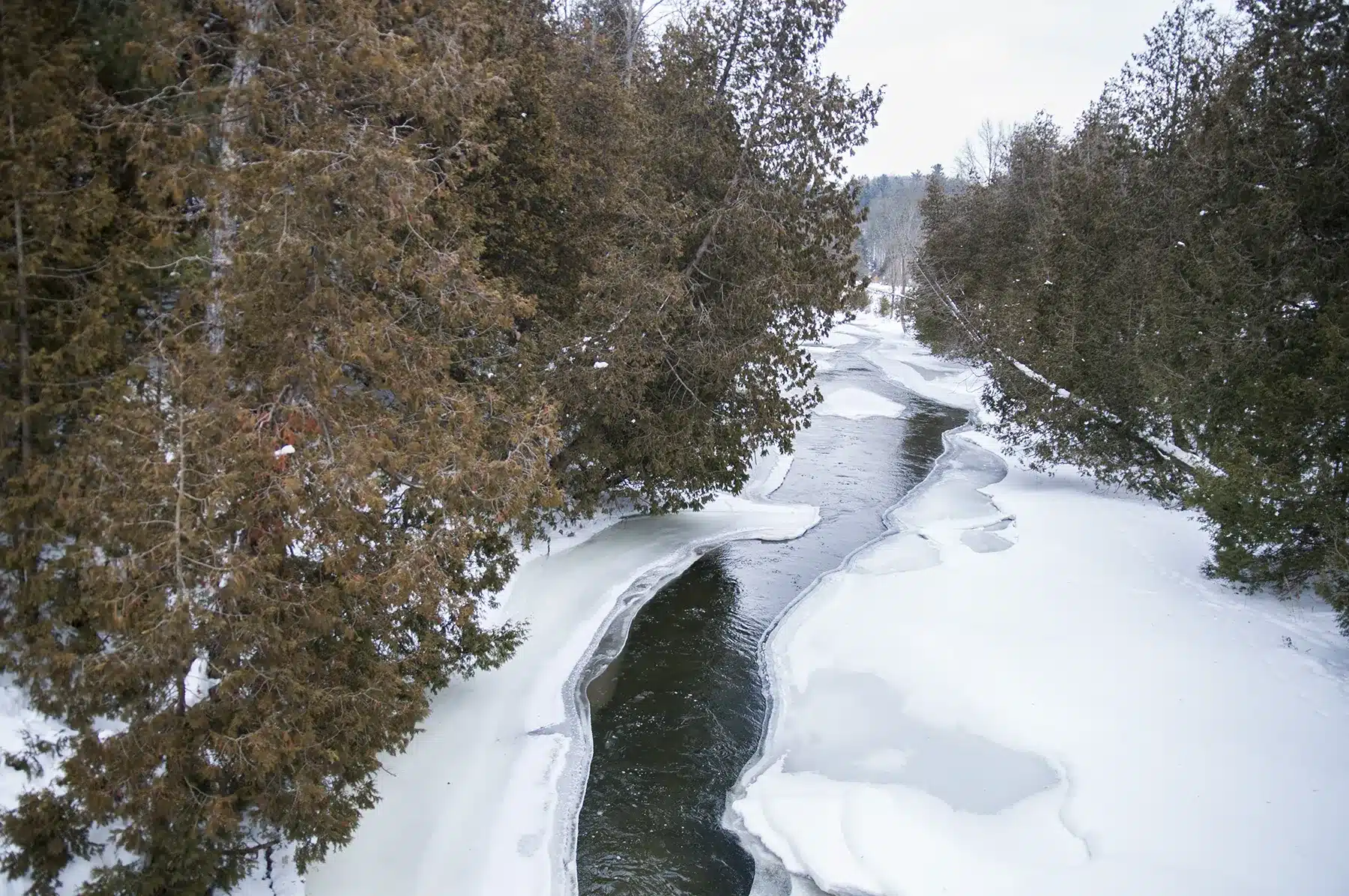 A partially frozen river flowing between snow-covered banks in a forested area.