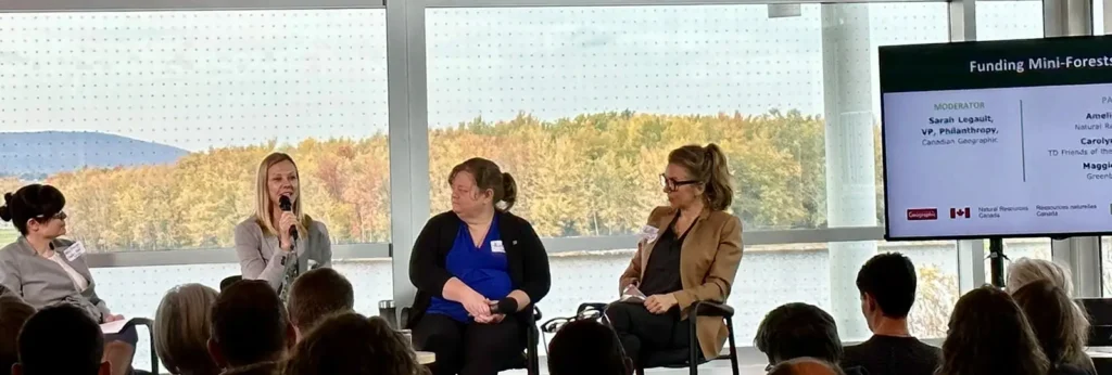 I was asked by one of our grantees, Green Communities Canada, and the Delphi Group to speak on a panel to discuss funding of mini-forests and future funding needs. Among the panelists was Carolyn Scotchmer of TD Friends of the Environment and Amelie Roberge of Natural Resource Canada.