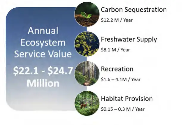 Stormwater management is only one of the many ecosystem services that the Upper Twelve Mile Creek subwatershed provides. Different approaches and previous studies were used to assess the value of additional community services, specifically recreation, carbon sequestration, freshwater supply, and habitat provision. Natural assets provide an estimated $22.1 – $24.7 million a year in value across these four services.