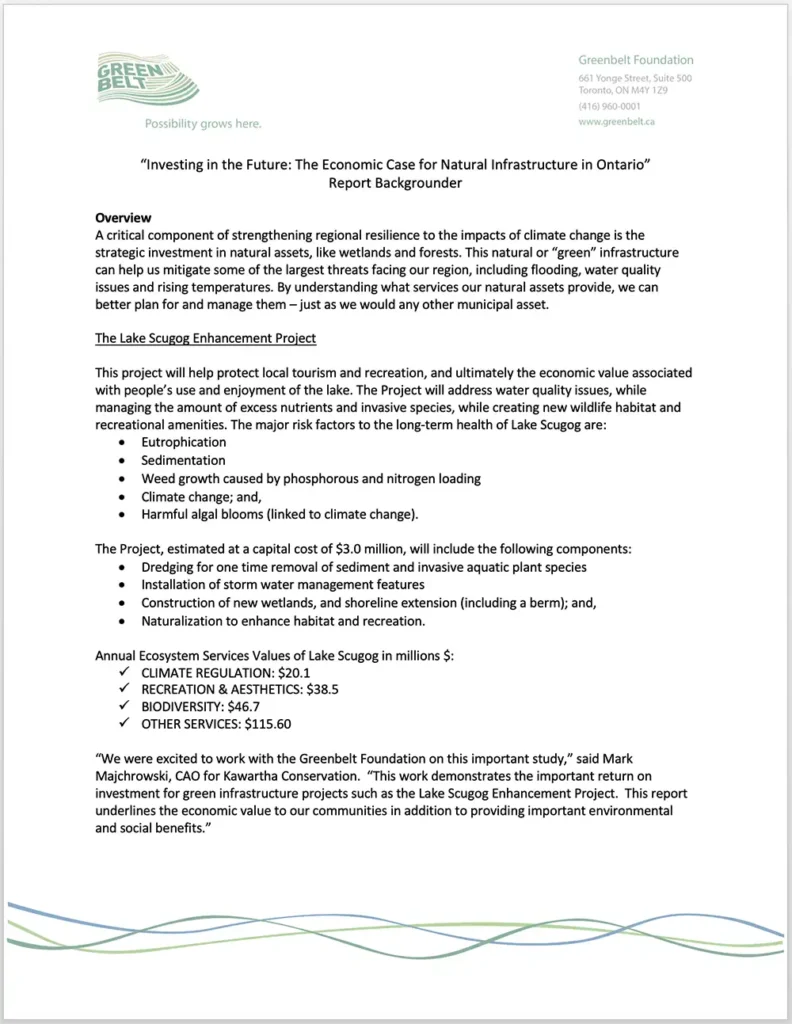Investing in the Future: The Economic Case for Natural Infrastructure in Ontario illustrates how by investing in natural areas, municipalities can save money, reduce reliance on expensive built infrastructure, mitigate the effects of extreme weather and create much-needed jobs. The Greenbelt Foundation worked on this report with three Conservation Authorities to determine the return-on-investment of ecological restoration efforts in their jurisdictions: the Brock Lands, Saltfleet Conservation Area and Lake Scugog.